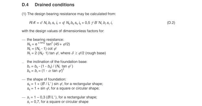# ----------------------------- # 4. BEARING CAPACITY FACTORS # ----------------------------- Nq = math.exp(math.pi * math.tan(phi_d)) * math.tan(math.pi / 4 + phi_d / 2) ** 2 Nc = (Nq - 1.0) / math.tan(phi_d) Ngamma = 2.0 * (Nq - 1.0) * math.tan(phi_d) # ----------------------------- # 5. CORRECTION FACTORS # ----------------------------- # Shape factors sq = 1.0 + (B_eff / L_eff) * math.sin(phi_d) sc = (sq * Nq - 1.0) / (Nq - 1.0) sgamma = 1.0 - 0.3 * (B_eff / L_eff) # ----------------------------- # 6. INCLINATION FACTORS # ----------------------------- Hd = math.hypot(Hxd, Hyd) load_ratio = min(Hd / Vd, 0.99) iq = (1.0 - load_ratio) ** 2 igamma = (1.0 - load_ratio) ** 2 ic = iq - (1.0 - iq) / max(Nc * math.tan(phi_d), 1e-9)